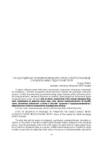 - Скиба, Галина Михайлівна (2018) State of research of problems of formation the subject-subject interaction of students in educational theory Дидактика: теорія і практика. pp. 56-61. ISSN ISBN 978-966-644-486-1