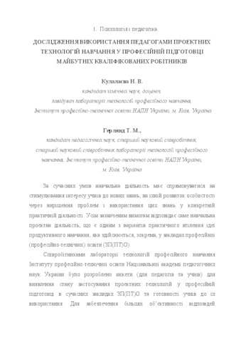 - Кулалаєва, Наталя Валеріївна and Герлянд, Т.М. (2018) Study of the use of project technologies by teachers in the professional training of future skilled workers International Multidisciplinary Conference «Science and Technology of the Present Time: Priority Development Directions of Ukraine and Poland» Wolomin, Republic of Poland, 19–20 October 2018, 6. pp. 28-31.
