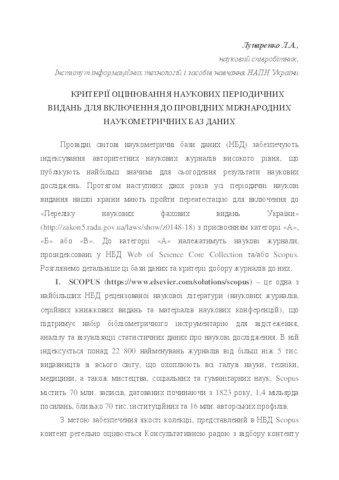 - Лупаренко, Л. А. (2018) Criteria for evaluating scientific periodicals for inclusion in the leading international scientometrics databases In: Актуальні питання сучасної інформатики» в межах ІІI Всеукраїнської науково-практичної конференції з міжнародною участю «Сучасні інформаційні технології в освіті та науці» . ЖДУ, м. Житомир, Україна, pp. 8-12.