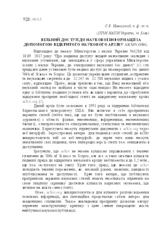 - Новицький, С.В. (orcid.org/0000-0003-2640-5121) (2018) Free access to scientific information through the open scientific archive arXiv.org In: IX науково-практична конференція з міжнародною участю "Мультимедійні технології в освіті та інших сферах діяльності" . Національний авіаційний університет, м. Київ, Україна, p. 55.