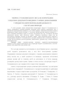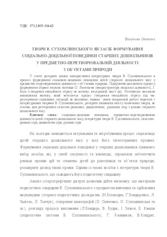 - Васильєва, С.А. (orcid.org/0000-0002-0452-4835) (2018) Creations of V. Sukhomlinsky as a means of forming social and integrated behavior of senior preschoolers in the subject-transforming activity with objects of nature Науковий вісник Східноєвропейського національного університету імні Лесі Українки, 2 (375). pp. 46-52. ISSN 1729-360Х