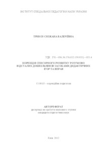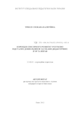 - Трикоз, С. В. (orcid.org/0000-0002-5929-589X) (2012) Correction of sensory development of mentally retarded preschoolers means of didactic games and exercises Dissertation candidate2 thesis, Інститут спеціальної педагогіки.