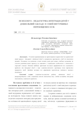 - Мельничук, Т.І. (orcid.org/0000-0002-5205-9958) and Лосева, О.В. (2018) Psychological and pedagogical integration of children in pre-school institutions from families of internally displaced persons Психологічний часопис, 1 (11). pp. 96-110. ISSN 2414-004X