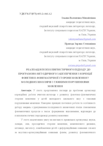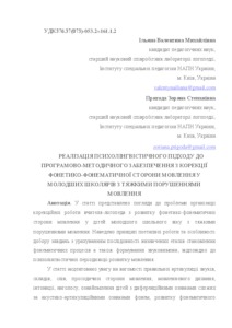 - Ільяна, Валентина Михайлівна (orcid.org/0000-0001-5208-8399) and Пригода, Зоряна Степанівна (2017) Psycholinguistic approach realization as a basis of phonetical-phonematical side of speech development in primery school students with severe speech disorders Особлива дитина: навчання і виховання, 3 (83). pp. 40-46. ISSN 2312-2781