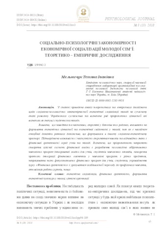 - Мельничук, Т.І. (orcid.org/0000-0002-5205-9958) (2018) Socio-psychological regularities of the economic socialization of a young family: theoretical-empirical research Психологічний часопис, 3 (13). pp. 96-110. ISSN 2414-004X