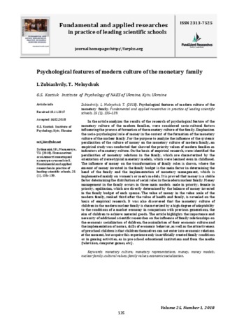 In the article analyzes the results of the research of psychological feature of the monetary culture of the modern families, were considered socio-cultural factors influencing the process of formation of the monetary culture of the family. Emphasizes the socio-psychological role of money in the context of the formation of the monetary culture of the nuclear family. For the purpose to analyze the influence of the systemic peculiarities of the culture of money on the monetary culture of modern family, an empirical study was conducted that showed the priority values of modern families as indicators of monetary culture. On the basis of empirical research, were identified the peculiarities of monetary relations in the family, which are characterized by the orientation of stereotypical monetary models, which were learned even in childhood. The influence of money on the transformation of family roles is shown, where the amount of money invested in the family budget is the main factor in determining the head of the family and the implementation of monetary management, which is implemented mainly on women's or men's models. It is proved that money is a stable factor determining the distribution of social roles in the modern nuclear family. Money management in the family occurs in three main models: male in priority; female in priority; egalitarian, which are directly determined by the balance of money invested in the family budget of each spouse. The value of money in the value scale of the modern family, ranked third after the value of health and family, is revealed on the basis of empirical research. It was also discovered that the monetary culture of children in the modern nuclear family is characterized by a high degree of adaptability to the conditions of a market economy in comparison with previous generations, the aim of children to achieve material goods. The article highlights the importance and necessity of additional scientific researches on the influence of family relationships on the economic socialization ofchildren, the assimilation of their economic culture and the implementation of norms, skills of economic behavior, as well as the attractiveness of preschool children is that children themselves can not enter into economic relations at the moment, but acquire this experience only in artificially created family conditions or in gaming activities, as in pre-school educational institutions and from the media (television, computer games, etc.).