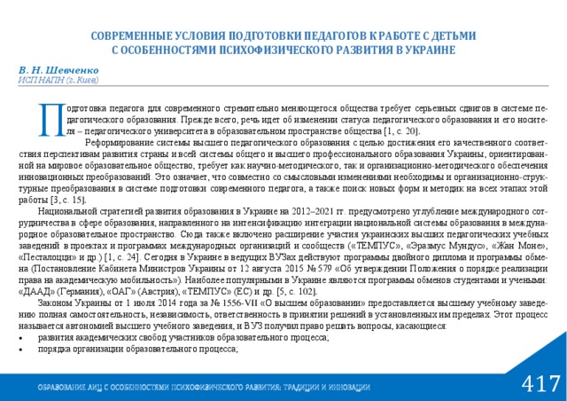 - Шевченко, В.М. (orcid.org/0000-0003-0119-3206) (2018) Modern conditions for preparing teachers to work with children with peculiarities of psychophysical development in Ukraine Education of persons with peculiarities of psychophysical development: traditions and innovations. pp. 417-419.