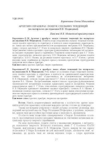 - Боровицька, О.М. (2018) Archetype and pre-image: search of common trends (on the materials of the study by N.V. Medvedeva) Актуальні проблеми психології, 24 (12). pp. 27-33. ISSN 2072-4772
