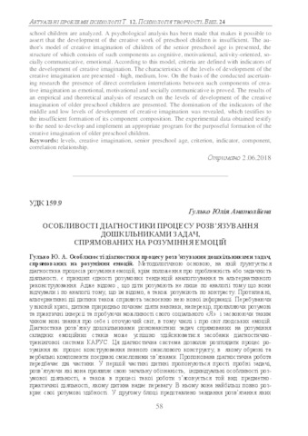 - Гулько, Ю. А. (2018) The diagnostic features of the problems solving process concerning understanding emotions by preschool children Актуальні проблеми псхології, 24 (12). pp. 58-68. ISSN 2072-4772