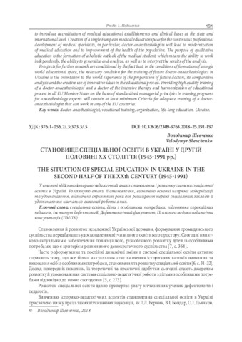 - Шевченко, В.М. (orcid.org/0000-0003-0119-3206) (2018) The Situation of Special Education in Ukraine in the Second Half of the 20th Century (1945-1991) Teacher education: theory and practice, 1 (2) (25). pp. 191-197. ISSN 2309-9763