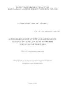 - Ільяна, Валентина Михайлівна (orcid.org/0000-0001-5208-8399) (2010) Dyslexia overcoming at students with severe speech disabilities of primary schools Dissertation candidate2 thesis, Інститут спеціальної педагогіки.