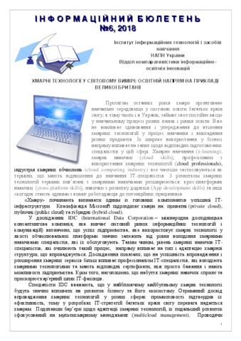 - Малицька, І.Д. (orcid.org/0000-0003-1598-0120) (2018) Information Bulletin № 6, 2018 "Cloud Technologies in a Global Dimension: An Educational Approach on the Example of the Great Britain" Інститут інформаційних технологій і засобів навчання НАПН України, м. Київ, Україна.
