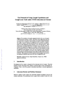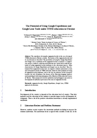 - Shapovalov, Ye.B. (orcid.org/0000-0003-3732-9486), Bilyk, Zh.I. (orcid.org/0000-0002-2092-5241), Atamas, A.I. (orcid.org/0000-0002-8709-3208), Shapovalov, V.B. (orcid.org/0000-0001-6315-649X) and Uchitel, A.D. (orcid.org/0000-0002-9969-0149) (2018) The Potential of Using Google Expeditions and Google Lens Tools under STEM-education in Ukraine Proceedings of the 1st International Workshop on Augmented Reality in Education Kryvyi Rih, Ukraine, October 2, 2018 (2257). pp. 66-74. ISSN 1613-0073