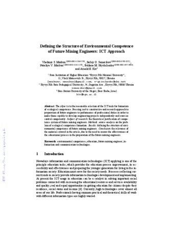 - Morkun, Volodymyr (orcid.org/0000-0003-1506-9759), Semerikov, Serhiy O. (orcid.org/0000-0003-0789-0272), Morkun, N.V. (orcid.org/0000-0002-1261-1170), Hryshchenko, Svitlana (orcid.org/0000-0003-4957-0904) and Kiv, A.E. (2018) Defining the Structure of Environmental Competence of Future Mining Engineers: ICT Approach Proceedings of the 1st International Workshop on Augmented Reality in Education Kryvyi Rih, Ukraine, October 2, 2018 (2257). pp. 198-203. ISSN 1613-0073
