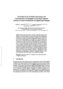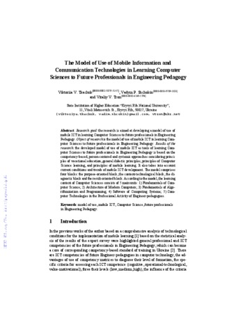 - Tkachuk, V.V. (orcid.org/0000-0002-5879-5147), Shchokin, V.P. (orcid.org/0000-0001-9709-1831) and Tron, V.V. (orcid.org/0000-0002-6149-5794) (2018) The Model of Use of Mobile Information and Communication Technologies in Learning Computer Sciences to Future Professionals in Engineering Pedagogy Proceedings of the 1st International Workshop on Augmented Reality in Education Kryvyi Rih, Ukraine, October 2, 2018 (2257). pp. 103-111. ISSN 1613-0073