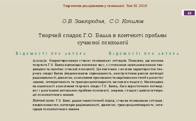 - Завгородня, О.В. and Копилов, Сергій Олегович (2018) G. A. Ball's creative heritage in the context of modern psychology problems Теоретичні дослідження у психології, 3. pp. 136-151. ISSN 2616-6860