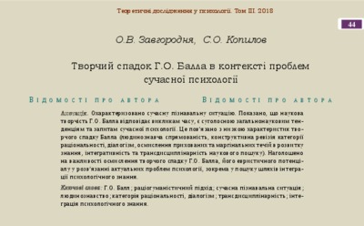 O.V. Zavgorodnia, S.O. Kopilov. Tvorchii` spadok G.O. Balla v kontekstі problem suchasnoї psihologії.pdf Download (415kB) | Preview |