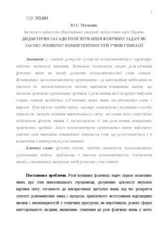 - Мельник, Ю.С. (2018) Didactics principles of untiing of physical tasks as to the means development of competence students of gymnasium Наукові записки, 1 (169). pp. 91-94.