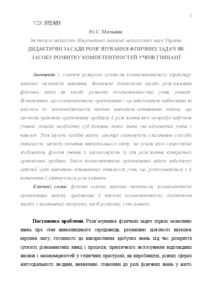 Еssence of competence character of task technology of studies opens up in the article. Didactics principles of untiing of physical tasks as are determined the means of development competence students in gymnasium. Competence is oriented – it an educational-cognitive task that contains the practical oriented problem and the decision of that needs acquisition the students in gymnasium of necessary subjectively new knowledge and corresponding abilities and skills is maximally close on maintenance to the vital functions of man. Deciding similar tasks, schoolchildren seize the generalized methods of activity, methods cognitions of the surrounding world, on the basis of that physical knowledge independently obtain and apply them for the decision of certain practical problems. The table of contents of competence oriented task provides the integral cycle of educational-cognitive activity of student that is begun with her determination and ends with a decision. Untiing of such task consists in renewal and searching for of unknown sizes. The analysis of her condition begins from the choice of the physical system completed by the stowage of eventual amount of equalizations, that envisages dividing of process untiing of the put task into the physical, mathematical and analytical stages.