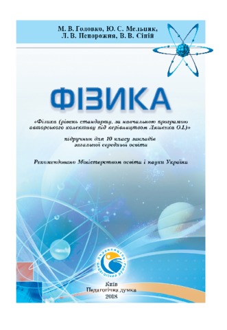 Головко, Микола Васильович, Мельник, Ю.С. (orcid.org/0000-0002-1268-6199), Непорожня, Лідія Вікторівна (orcid.org/0000-0002-6984-7918) and Сіпій, Володимир Володимирович (orcid.org/0000-0003-4825-1426) (2018) "Physics (level of standard, according to the curriculum of the author's team under the direction of Lyashenko O.I.)" textbook for the 10th form of institutions of general secondary education . Педагогічна думка, м. Київ, Україна. ISBN 978-966-644-474-8