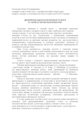 - Часнікова, Олена Володимирівна (orcid.org/0000-0002-8535-6668) (2018) Differentiation of economic education in the profile school In: Диференціація у шкільній освіті: історичний досвід і сучасні технології: збірник матеріалів Всеукраїнської науково-практичної конференції . Інститут педагогіки, м. Київ, Україна.