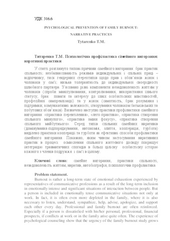 - Tytarenko, T.M. (orcid.org/0000-0001-8522-0894) (2018) Psychological prevention of family burnout: narrative practices Психологічні науки: проблеми і здобутки, 1 (11). pp. 176-191.