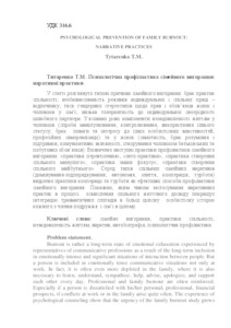 The article considers the typical causes of family burnout: lack of commonality practices; imbalance of the regime of individual and collective labor - recreation; gender stereotypes pressure regarding the rights and responsibilities of women and men in the family; low tolerance to the individual peculiarity of the marriage partner. There are different components of dissatisfaction with own lives in men (attempts to manipulate, to control them, to use their status; lack of respect and interest for their personality traits; their professional self-realization) and in women (loneliness, lack of understanding, and support; communicative dependencies; husband's ignoring of parental and domestic responsibilities). The effective practices of preventing family burnout are defined: “impersonation practice”, “lego-practice” “practice of common past creating” “practice of focus changing” “practices of common future creating”. Among the types of common family narratives (domination-subordination, autonomy, confluence, cooperation, and care) only the practices of cooperation and care are effective ways of preventing family burnout. It is shown how the application of narrative practices in the process of comprehension of the common life experience improves the integration of traumatic memories into a more coherent personal history of each member of the marriage particularly and the history of the family in the whole.