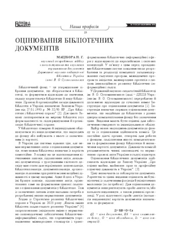- Мацібора, Надія Григорівна (2018) Evaluation of library documents Шкільна бібліотека плюс, 19/20 (368). pp. 23-24. ISSN 978-617-7536-03-0