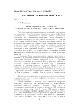 - Васьківська, Галина Олексіївна (orcid.org/0000-0002-8714-8512) (2018) Didactic Aspects of Socialization of Upper Secondary School Pupils in the Conditions of Profile Education Вісник Луганського національного університету (педагогічні науки), 8 (322). pp. 5-11.
