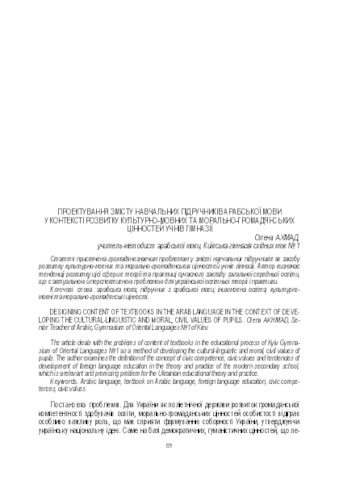 - Ахмад, Олена Рудольфівна (2018) Designing content of textbooks in the arab language in the context of developing the cultural-linguistic and moral, civil values of pupils Дидактика: теорія і практика, 1. pp. 61-66.