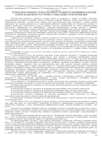 - Бондарчук, О.І. (orcid.org/0000-0003-3920-242X) (2018) Technology of development of psychological readiness of heads of educational institutions for activities in the conditions of social transformations Журнал "Післядипломна освіта в Україні", 1. pp. 84-87.