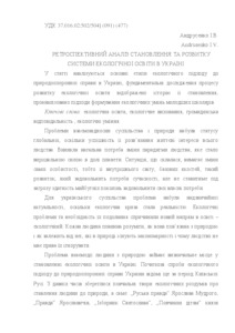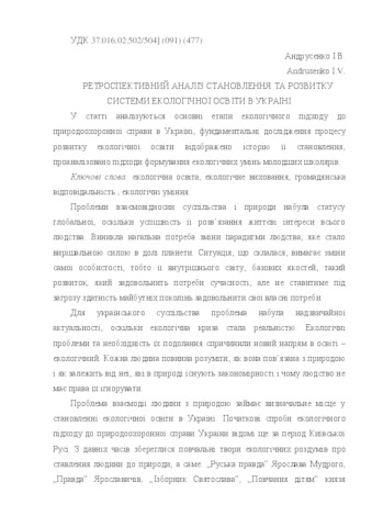 - Андрусенко, Ірина Володимирівна (2015) Retrospective analysis of the formation and development of the ecological education system in Ukraine Педагогічна освіта: теорія і практика, 1/2 (19). pp. 170-176. ISSN 2309-9763