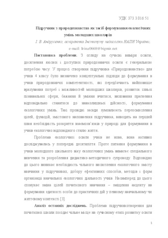 - Андрусенко, Ірина Володимирівна (2015) The textbook on natural science as a means of forming the ecological skills of junior schoolchildren Проблеми сучасного підручника, 1 (15). pp. 9-17. ISSN 978-966-544-404-5