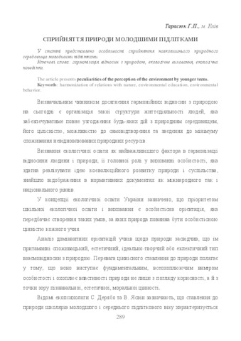 - Тарасюк, Галина Петрівна (orcid.org/0000-0002-0802-1565) (2018) Perception of nature by younger teens In: Сучасний виховний процес: сутність та інноваційний потенціал: матеріали звіт. наук.-практ. конф. Ін-ту проблем виховання НАПН України за 2017 рік , 6 . НАІР, м. Івано-Франківськ, Україна, pp. 289-293.