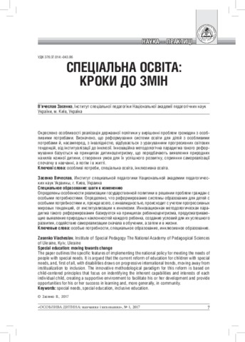 - Засенко, В.В. (orcid.org/0000-0003-0325-4578) (2017) Special education: moving towards change Особлива дитина: навчання і виховання, 1 (81). pp. 7-12. ISSN 2312-2781