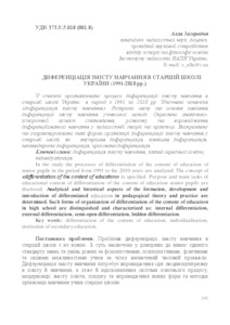 The article analyzes the processes of differentiation of the content of education in High School of Ukraine in the period from 1991 to 2010. Clarified the concept "Differentiation of learning content." Disclosed goals and main objectives differentiation of the city of training students. Analytical and historical aspect of formation, development and implementation differentiated learning in pedagogical theory and practice. highlighted and described such forms of organization of differentiation of the content of education in high school like: internal differentiation, external differentiation, semi-open differentiation, latent differentiation.