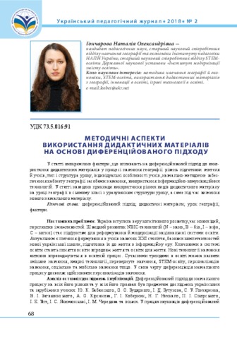- Гончарова, Наталія Олександрівна (orcid.org/0000-0002-2120-4542) (2018) Methodical aspects of using didactic materials on the basis of a differentiated approach Український педагогічний журнал, 2. pp. 68-74. ISSN 2411-7420