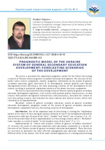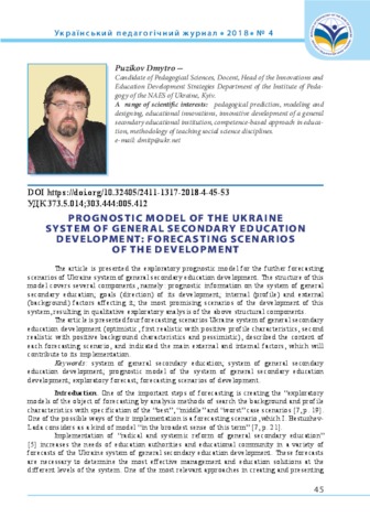 - Puzikov, Dmytro (orcid.org/0000-0003-2630-6924) (2018) Prognostic model of the Ukraine system of general secondary education development: forecasting scenarios of the development Український педагогічний журнал, 4 (16). pp. 45-53. ISSN 2411-1317