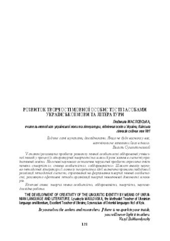 - Масловська, Людмила Григорівна (2016) The development of creativity of the linguistic identity by means of Ukrainian language and literature Дидактика: теорія і практика. pp. 128-136.