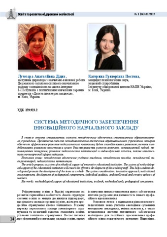 - Постова, К.Г. (orcid.org/0000-0001-9728-4756) and Дідик, Лучезара Анатоліївна (2017) System of methodical support of innovative educational institution Education and Development of Gifted personality, 1 (56). pp. 14-17. ISSN 2309 ‑3935