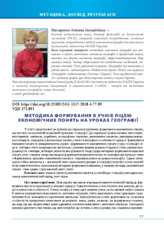 - Назаренко, Тетяна Геннадіївна (2018) Methodics of forming economic concepts in senior school students in the process of teaching geography Український педагогічний журнал, 4. pp. 77-85. ISSN 2411-1317