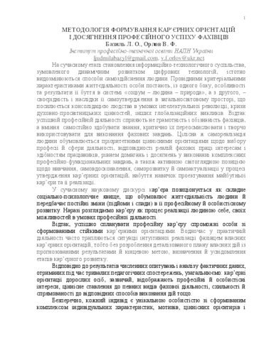 - Орлов, В.Ф. and Базиль, Л.О. (2018) Methodology of developing career orientations and enhancing professional success of specialists Концептуальні засади розвитку освіти дорослих: світовий досвід, українські реалії і перспективи. pp. 330-337. ISSN 978-966-316-438-0