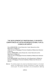 - Baranovska, Olena V. (orcid.org/0000-0002-0788-8511), Trubacheva, Svitlana E. (orcid.org/0000-0002-1400-9773) and Kosianchuk, Serhiy V. (orcid.org/0000-0003-1334-6011) (2018) The development of professionally oriented competences of upper secondary school pupils: curricular aspect In: Curriculumul școlar: provocări și oportunități de dezvoltare : materialele Conferinţei Ştiinţifice Internaţionale, 7–8 decembrie 2018, Chişinău , 1 . Institutul de Ştiinţe ale Educaţiei, c. Chişinău, pp. 452-457.