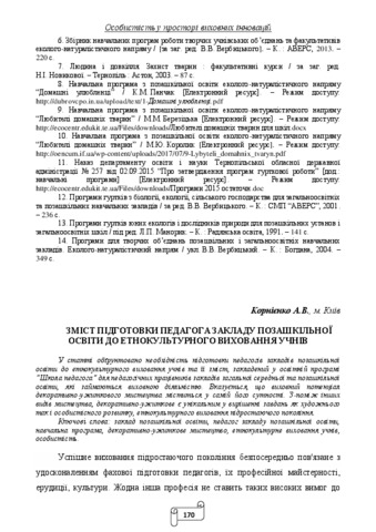 - Корнієнко, А.В. (orcid.org/0000-0001-7334-6625) (2018) The content of the teacher training of institution of out-of-school education for students’ ethno-cultural education In: Особистість у просторі виховних інновацій : матеріали Всеукр. наук.-практ. конф. Ін-ту проблем виховання НАПН України за 2018 рік . НАІР, м. Івано-Франківськ, Україна, pp. 170-175. ISBN 978-966-2716-99-3