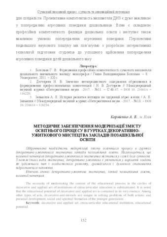 - Корнієнко, А.В. (orcid.org/0000-0001-7334-6625) (2018) Methodological support of modernization of the content of educational process in the clubs of decorative and applied art of institutions of out-of-school education In: Сучасний виховний процес: сутність та інноваційний потенціал: матеріали звіт. наук.-практ. конф. Ін-ту проблем виховання НАПН України за 2017 рік (6). НАІР, м. Івано-Франківськ, Україна, pp. 152-156.