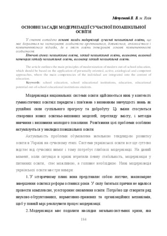 - Мачуський, В.В. (orcid.org/0000-0002-5932-6502) (2018) Basic principles of modernization of modern out-of-school education In: Сучасний виховний процес: сутність та інноваційний потенціал: матеріали звіт. наук.-практ. конф. Ін-ту проблем виховання НАПН України за 2017 рік (6). НАІР, м. Івано-Франківськ, Україна, pp. 184-189.