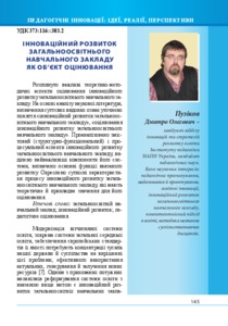 - Пузіков, Дмитро Олегович (orcid.org/0000-0003-2630-6924) (2015) Innovative development of a comprehensive educational institution as an object for assessment Український педагогічний журнал, 3. pp. 145-157. ISSN 2411-1317