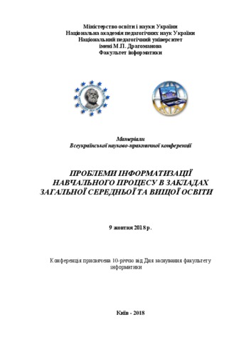 - Семеріков, С.О. (orcid.org/0000-0003-0789-0272) and Теплицький, І.О. (2018) Method of introduction of the Machine learning basics in the school course of informatics In: Проблеми інформатизації навчального процесу в закладах загальної середньої та вищої освіти : матеріали Всеукраїнської науково-практичної конференції, 09 жовтня 2018 року, м. Київ . Видавництво НПУ імені М. П. Драгоманова, м. Київ, Україна, pp. 18-20.