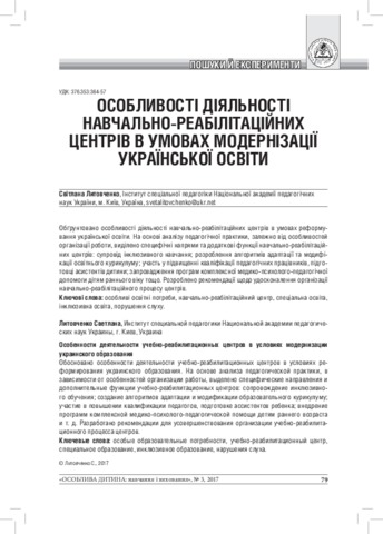 - Литовченко, С.В. (orcid.org/0000-0003-0001-4667) (2017) The peculiarities of education and Rehabilitation Center in the context of modernization of Ukrainian education Особлива дитина: навчання і виховання, 3 (83). pp. 79-87. ISSN 2312-2781