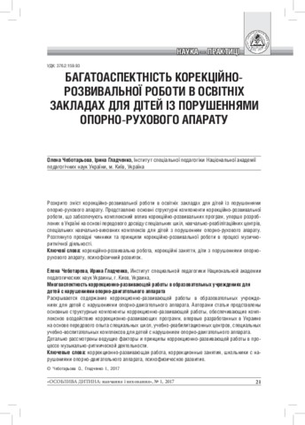 - Чеботарьова, О. В. (orcid.org/0000-0002-4560-3708) and Гладченко, І. В. (orcid.org/0000-0002-2013-8053) (2017) Multidimensional developmental technologies educational institutions for children with musculoskeletal system disorders Особлива дитина: навчання і виховання, 1 (81). pp. 21-30. ISSN 2312-2781